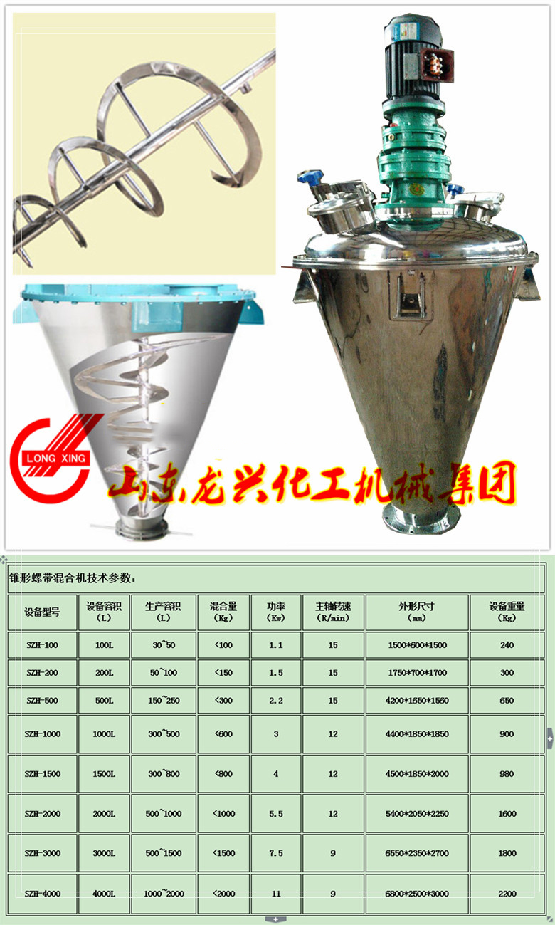 錐形螺帶混合機選精品立式錐形螺帶混合機就選山東龍興立式錐形螺帶混合機,購立式錐形螺帶混合機請認準選龍騰牌,謹防假冒!現價格優惠銷售0.1-10立方立式錐形螺帶混合機。