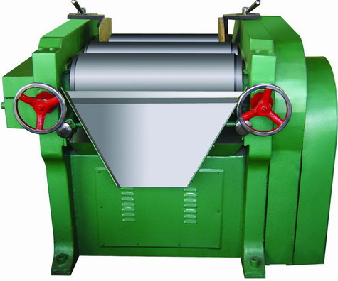 三輥研磨機(jī)是通過水平方向排列的三根輥筒不等速旋轉(zhuǎn)相互擠壓,使得相鄰軋輥產(chǎn)生強(qiáng)烈剪切力,從而磨擦、剪切,完成對(duì)漿料的研磨。